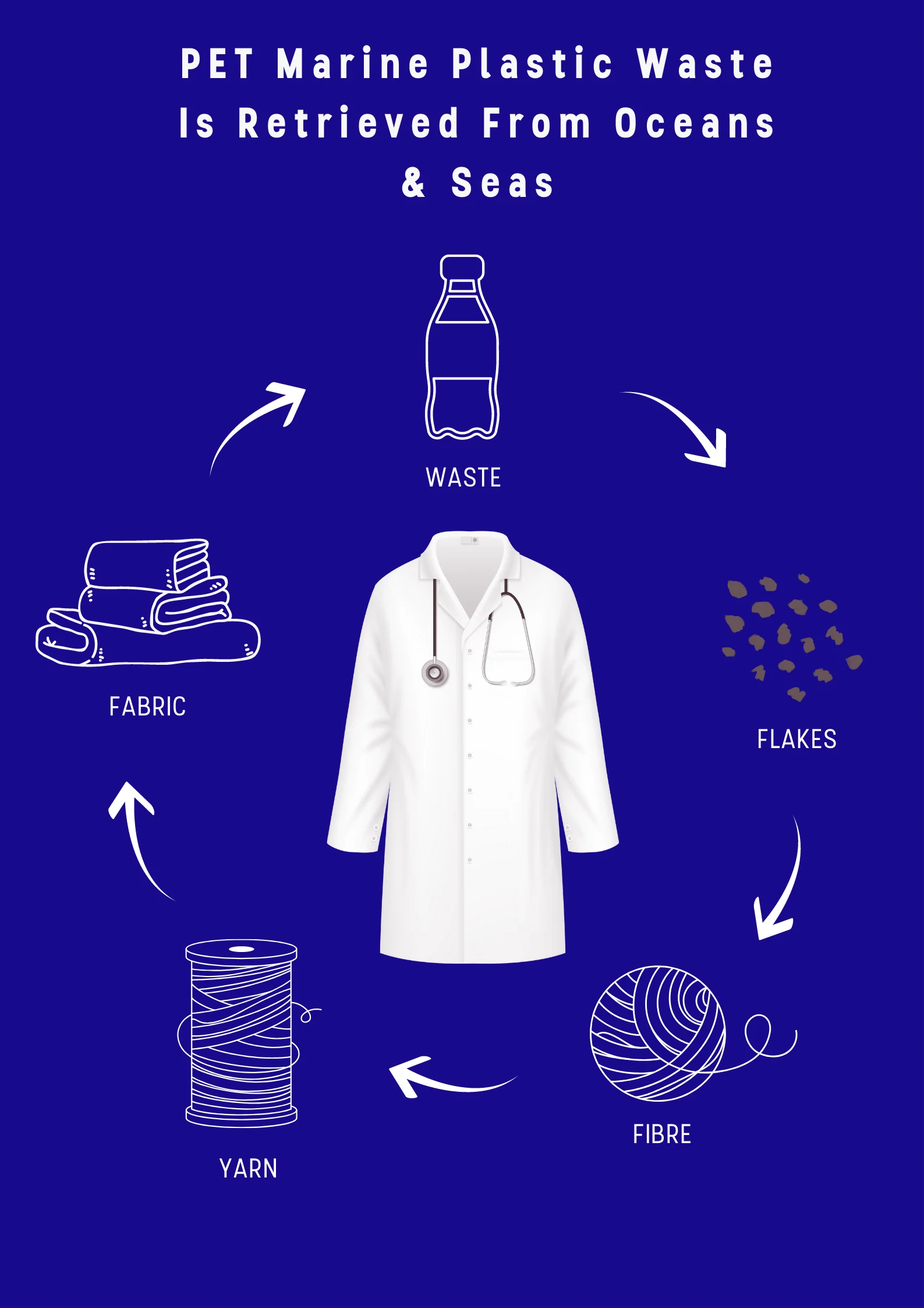 The use of upcycled plastic yarn to create recycled medical clothing for the healthcare industry brings together two positive practices – Doing good for nature and the people who do good. Healthcare workers spend long hours working across various hospital and dispensaries making it necessary that the clothing they wear is comfortable, durable and can be worn over long periods of time. We create clothing that comes from fibre generated from cleaned, processed, prepared waste plastic that will otherwise end up in landfills. Approximately 7-9 bottles go into the making of every piece of medical clothing, keeping them away from affecting the environment, thereby giving us another opportunity for their reuse.